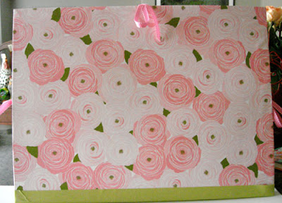 I love the fact that I can make my own portfolio's to carry my art work, instead of buying a generic one. I was in Paper-Source last week and saw this rose cover paper and knew it was meant to be on my next portfolio. For the inside I used sage w/gold leaf tissue paper. I finished the portfolio with pink ribbons and green binding tape.