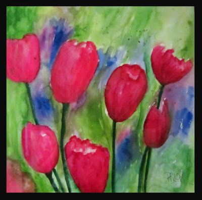 Several years ago I started a series of 4 watercolors of tulips. Up until today only 3 of the 4 were complete and hanging up on my wall. The watercolors were grouped together with the 4th fame empty. Well today that 4th frame is no longer empty.
